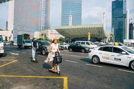 Tel Aviv Israel July 15, 2019 View of unknown Israeli people rolling with a electric scooter in the streets of Tel Aviv in the afternoon