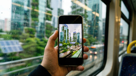 A hand holding a smartphone taking a photo of the city outside, the city features skyscrapers covered in greenery and solar panels