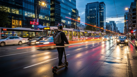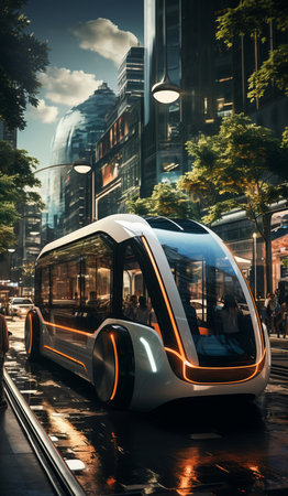 Future of public transportation: Electric vehicles on futuristic cityscape background.