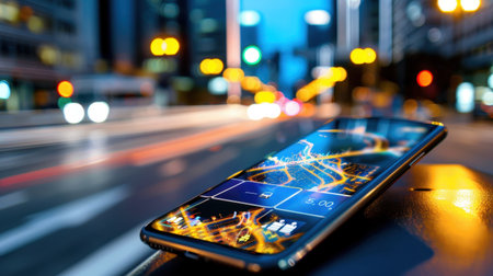 A sleek smartphone rests on a table amidst a vibrant city during twilight, showcasing a dynamic digital interface with financial data, creating a fusion of technology and urban life.