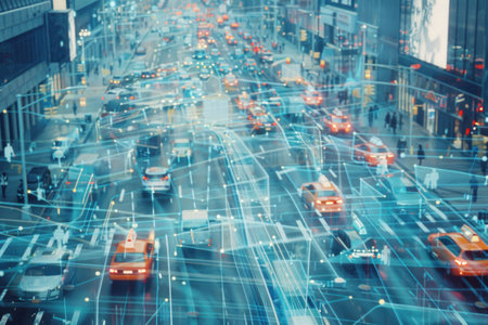 Urban traffic scene with digital overlays representing connectivity and data flow in a busy city environment