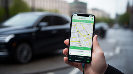 A smartphone displaying a navigation app is held up against a modern cityscape. The image captures a metropolitan vibe with daylight tones, emphasizing clean composition and realism.