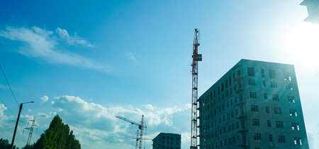 Construction site background. Hoisting cranes and new multi-storey buildings. Industrial background.Building construction site work against blue sky