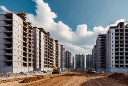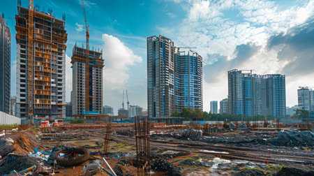 A bustling urban construction site featuring tower cranes and modern skyscrapers under development, set against a dynamic cityscape and blue sky.