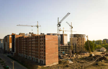Construction site with multi-storey residential buildings under construction. Tower cranes in action on blue sky background.