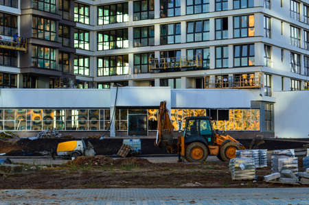 residential complex under construction with beautiful modern children playground and in background construction site with cranes.