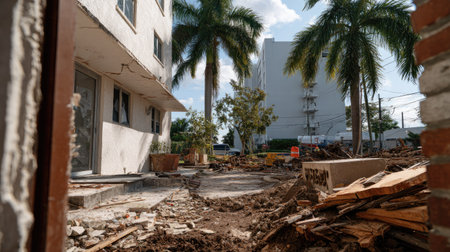 An urban scene depicting destruction and reconstruction with broken concrete, debris, and tropical palm trees under a clear blue sky.