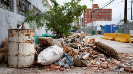 This image captures an abandoned urban site featuring a large pile of construction debris, waste materials, and vegetation.