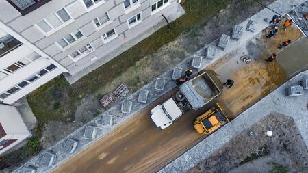 laying of paving slabs on the prepared concrete surface. Repair of the pedestrian walkway in the city. urban municipal work