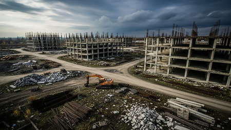 A busy construction site with heavy machinery works amidst concrete debris, representing urban transformation and demolition efforts in a formerly vacant area, signifying progress and change