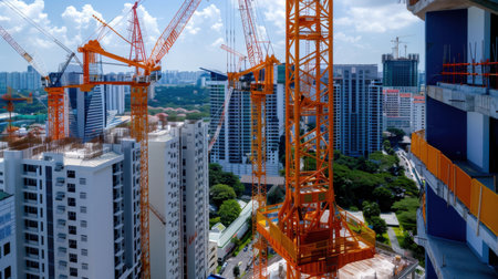 A dynamic urban construction scene featuring multiple tower cranes against a bright blue sky, highlighting the ongoing development of modern buildings in a bustling city.