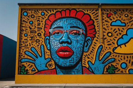 Closeup portrait of a womans face painted on a vibrant wall with colorful artistic details
