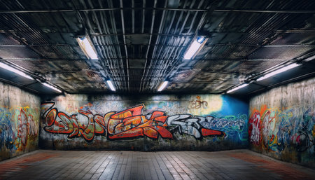 Urban art in a hidden place Colorful and detailed graffiti, gloomy atmosphere, underground atmosphere