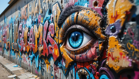 This captivating street art mural showcases a striking blue eye surrounded by vibrant colors and intricate designs, symbolizing urban creativity and expression.