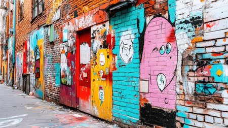 This image captures a vibrant graffiti alleyway adorned with unique murals and colorful street art, showcasing urban creativity and artistic expression.