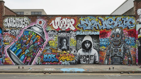 An AI generated illustration of an urban street scene featuring a graffiti-covered wall