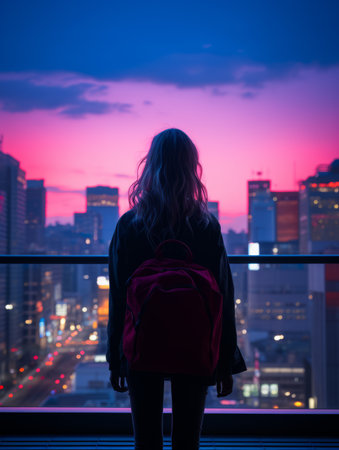 a woman with a backpack standing in front of a city at sunset