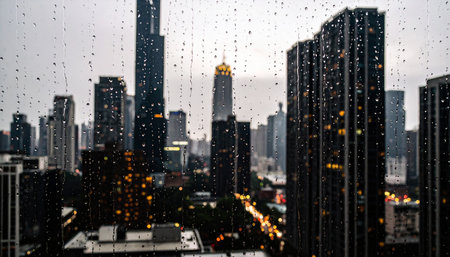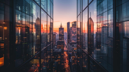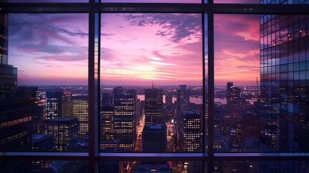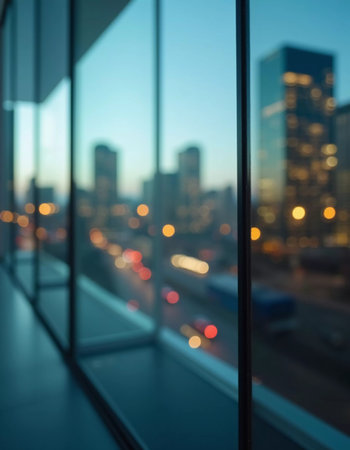 A blurred perspective showcases a modern city skyline through a glass wall during twilight, revealing the vibrancy and complexity of urban life. The fading light reflects city energy. Generative AI.