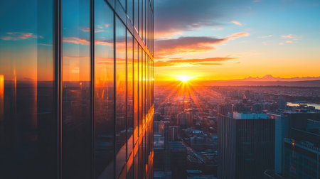 A breathtaking aerial view of a vibrant cityscape at sunset, with reflective skyscrapers and busy streets illuminating the scene as the sun sets on the horizon.