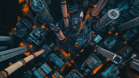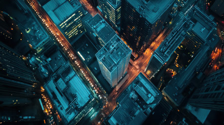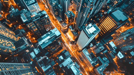 Stunning aerial view of a bustling urban cityscape at dusk, showcasing towering skyscrapers illuminated by city lights. The intricate layout reveals dynamic energy and architectural beauty.