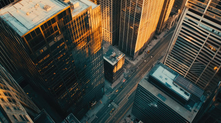Captivating aerial view of a bustling urban landscape, featuring towering skyscrapers and busy streets illuminated by warm sunlight, ideal for architecture enthusiasts.