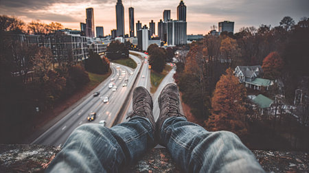 An individual sits with legs outstretched, offering a first-person view of a city skyline. The composition features a highway cutting through a landscape, framed by trees. The image presents a blend of urban and natural elements, bathed in warm sunset hues, suitable for various editorial and commercial applications.