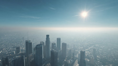Stunning aerial view of the Los Angeles skyline with skyscrapers illuminated by sunlight, amidst a layer of morning fog and blue sky.