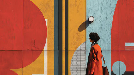 Woman in Red Coat Passing Colorful Geometric Street Art on Urban Wall
