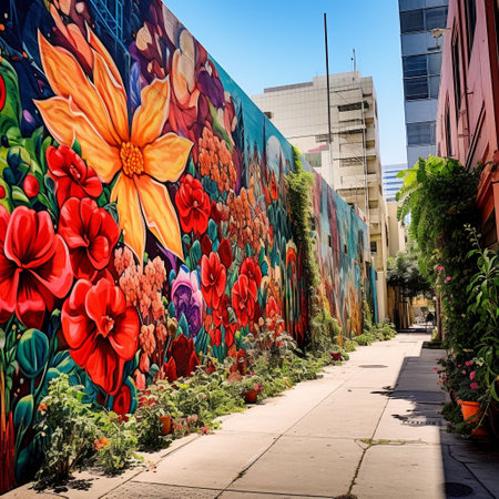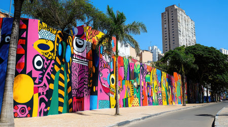 A vibrant mural adorns a city wall, showcasing a colorful array of designs and characters. This artwork brings life to the urban landscape, creating an inspiring outdoor atmosphere.