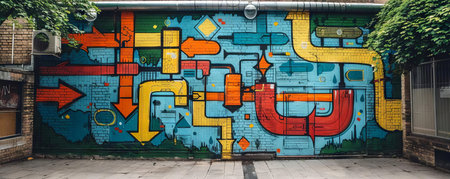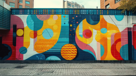A vibrant abstract mural showcases colorful geometric shapes and playful patterns. This stunning street art piece adds a lively touch to the urban landscape, inspiring creativity.