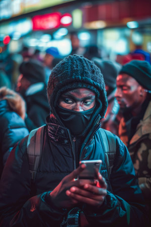A man with a black hat and a black hoodie is looking at his cell phone.