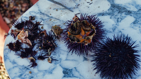 Fresh sea urchins with orange eggs ready to eat on the rocks