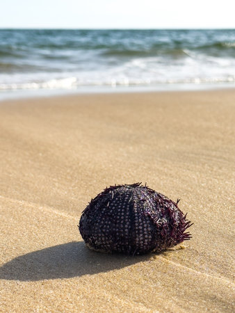 Sea urchin shell on the beach. Dead water animal with sharp spikes. Tropical climate in Cape Verde. Selective focus on the object, blurred background.