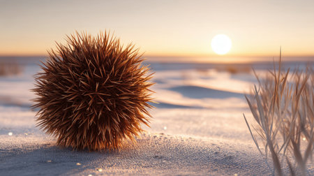 A striking brown spiky sphere stands out against a snow-covered landscape during sunset, capturing the serene beauty of winter in a tranquil, golden-lit scene.
