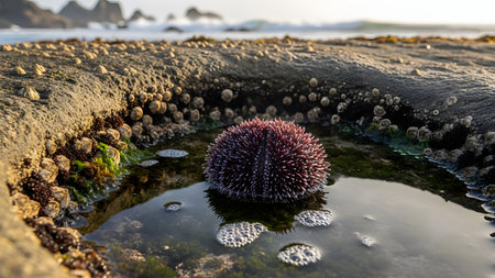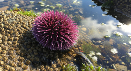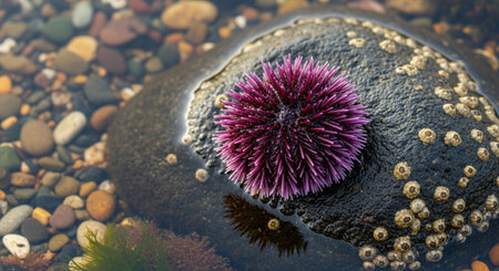 A purple sea urchin rests in a shallow tide pool surrounded by textured rocks and small barnacles. The image captures the unique marine life and coastal ecosystem in vibrant detail.