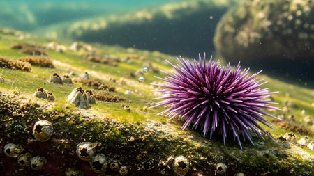 Sea urchins underwater in the Atlantic ocean (purple sea urchin Paracentrotus lividus) Generative AI