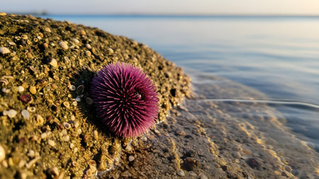 A vibrant purple sea urchin shell resting on a sandy rock at the water's edge during the golden hour. The sunlight highlights the detailed texture of the shell against the blurred blue ocean background.