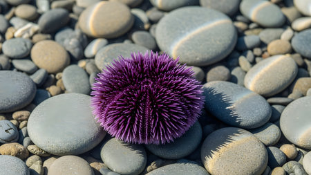 A vibrant purple sea urchin shell rests atop a bed of smooth, grey river stones, highlighted by natural sunlight. The spiky texture of the urchin contrasts with the rounded pebbles, creating a striking nature composition.