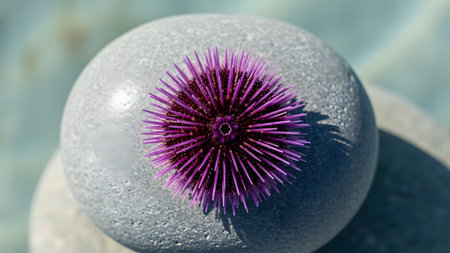 A vibrant purple sea urchin rests on top of a smooth, round grey stone. The symmetry and color contrast create a zen-like, natural composition highlighting marine life textures.