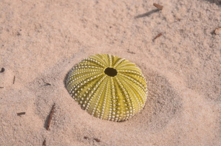 Sea urchin green lies on the sand. Dried shell of the sea urchin without needles located on the background of fine sand, close-up. Selective focus
