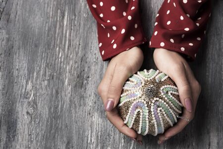Sea urchin shell on wood background Selective focus with shallow depth of field
