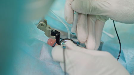 Close-up plan for placing an endoscopic instrument during surgery on an animal. Conducting endoscopic sterilization in an animal under anesthesia. Veterinary surgery concept.