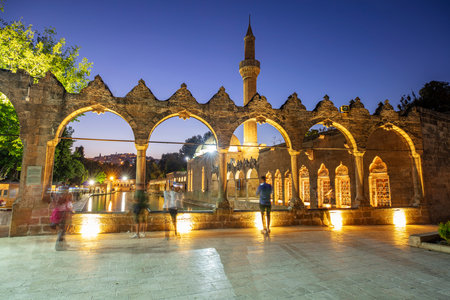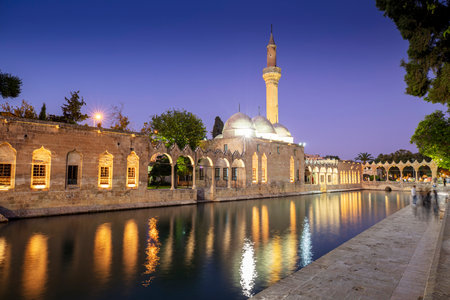 Sanliurfa, Turkey - June 19, 2023 : Balıklıgöl (Balık Lake) and Rizvaniye Mosque Landscape in beautiful sunset scenery in Şanlıurfa, Turkey.
