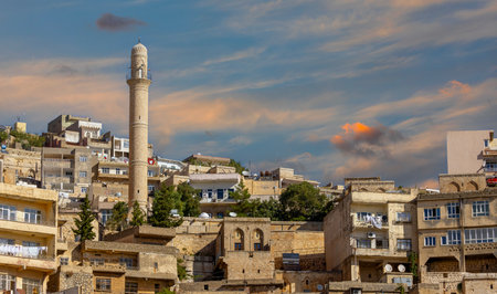 Mardin, Turkey - January 2020: Minaret of Ulu Cami, also known as Great mosque of Mardin, suitable for copy space. Grand mosque of Mardin is the main mosque for local muslim people to pray