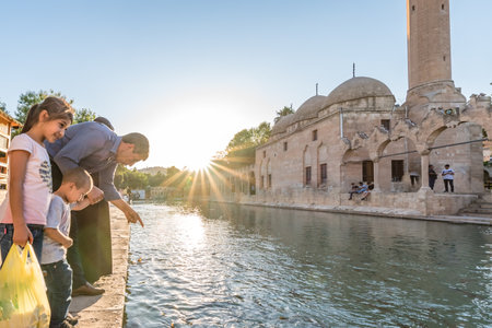 Unidentified people visit Halil-Ur Rahman Lake or named Balikli Gol(fish lake) in Sanliurfa,Turkey.18 July 2018