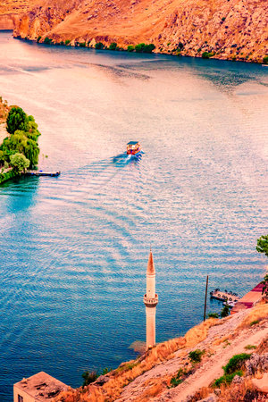 Halfeti town,submerged under waters of Birecik Dam in Sanliurfa,Turkey.