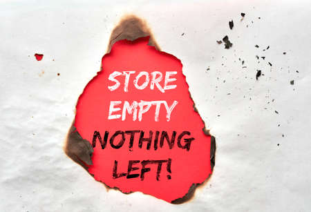 Paper hole with burned edges, text Store Empty Nothing Left on red paper in the hole. Boutique shops, stores looted, owners in despair. Aftermath concept. Protests, riots and looting in New York City.