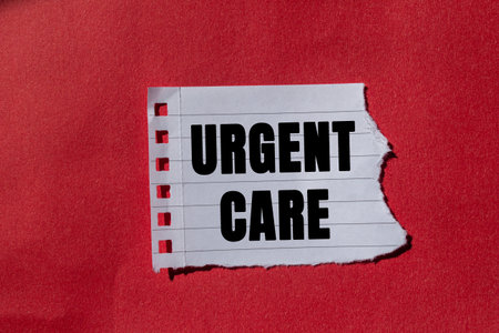 Urgent Care message written on torn torn lined paper on red background. Conceptual Urgent Care symbol. Copy space.