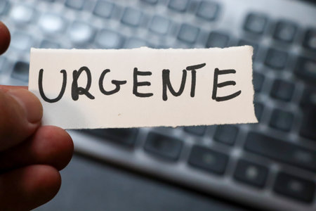 Close-up view of a hand holding a note with the word URGENTE against a blurred keyboard background symbolizing urgency in communication and tasks.