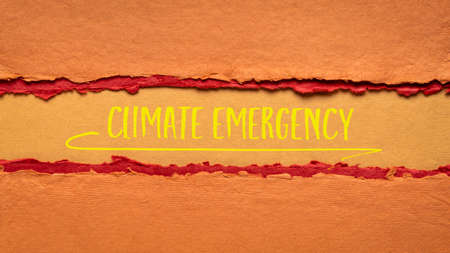 climate emergency word abstract, handwriting on a handmade paper in red and orange tones, global warming concept